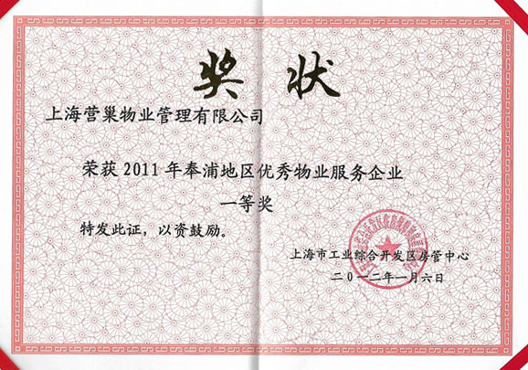 2011年奉浦地區(qū)優(yōu)秀物業(yè)服務(wù)企業(yè)一等獎(jiǎng)