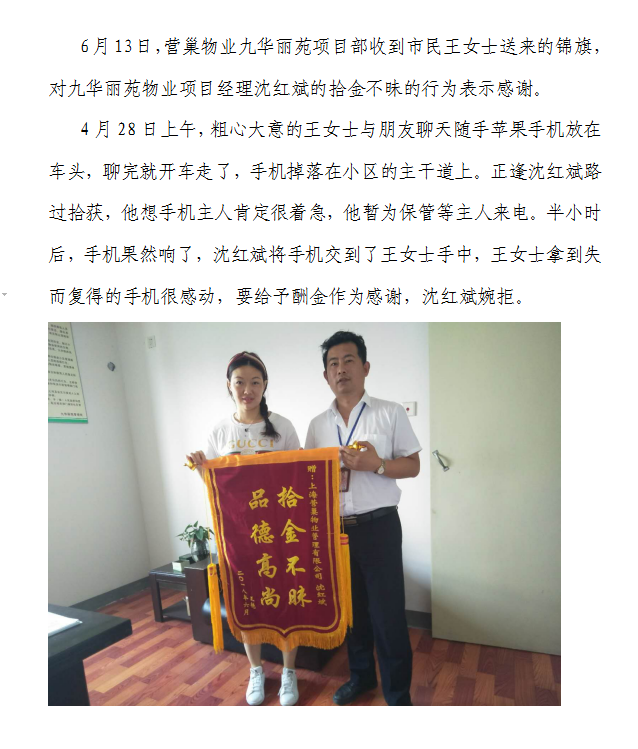 營(yíng)巢物業(yè)人拾金不昧獲贊許