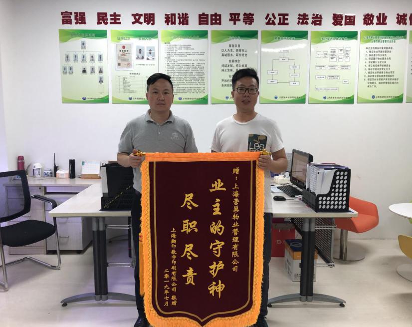 三、上海營巢物業(yè)管理有限公司在快速、有效處置鳳創(chuàng)谷科創(chuàng)基地火災安全隱患中,得到了當?shù)卣坝嘘P(guān)部門的高度評價,7月11日還收到了業(yè)戶翔印公司的錦旗,高度贊揚了鳳創(chuàng)谷科創(chuàng)基地物業(yè)企業(yè)值班人員盡心盡職的精神,讓我們深深地認識到,安全工作只有起點,沒有終點。